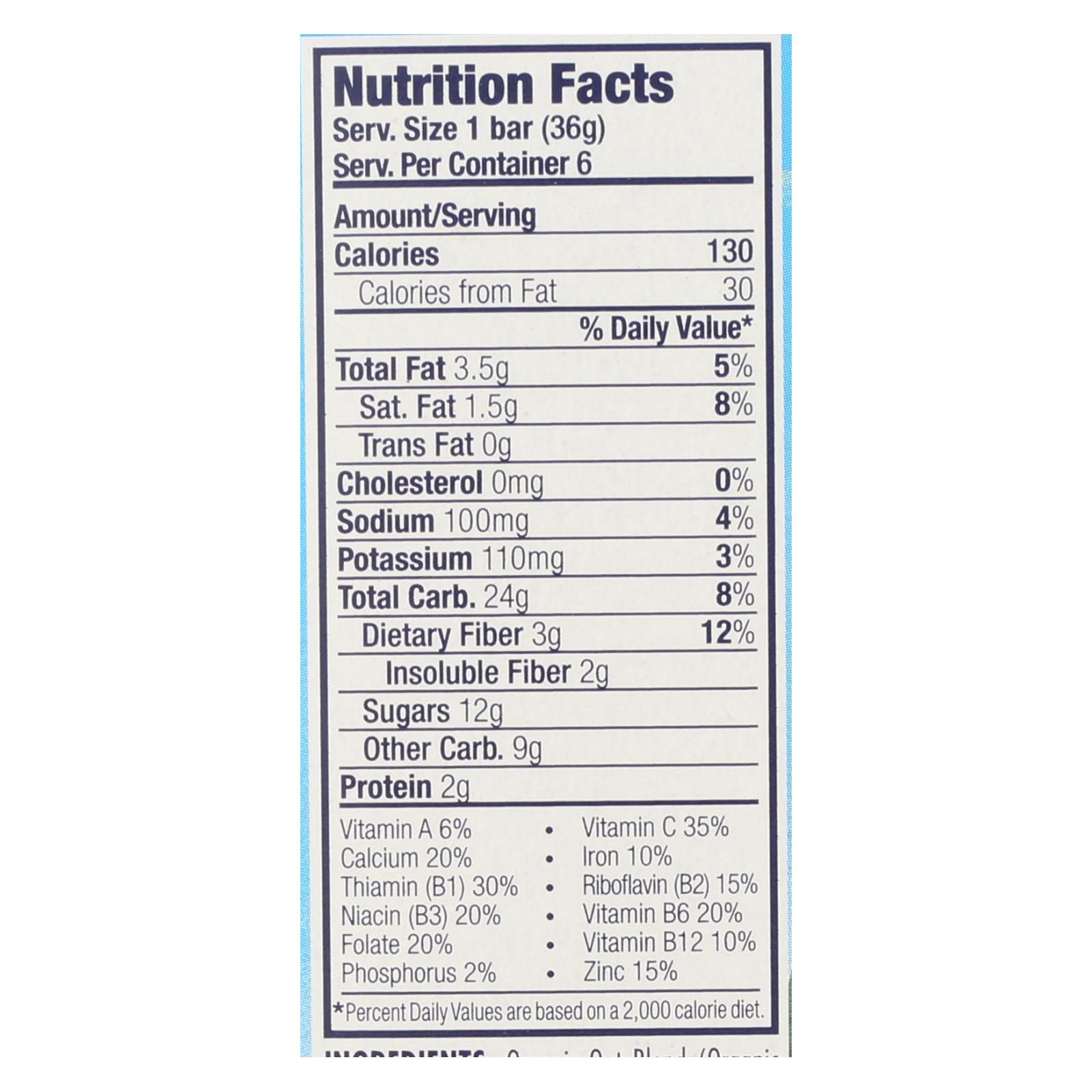ingredients : calcium carbonate;dicalcium phosphate;ascorbic acid (vit. C);ferric orthophosphate (iron);zinc oxide;niacinamide (vit. B3);beta carotene (vit. A);thiamine mononitrate (vit. B1);riboflavin (vit. B2);pyridoxine hydrochloride (vit. B6);folic acid (vit. B9);cyanocobalamin (vit. B12);organic oat blend (organic rolled oats, organic oat flour, organic oat fiber);organic tapioca syrup;organic chocolate chips (organic dried cane syrup, organic unsweetened chocolate, organic cocoa butter, organic soy leci