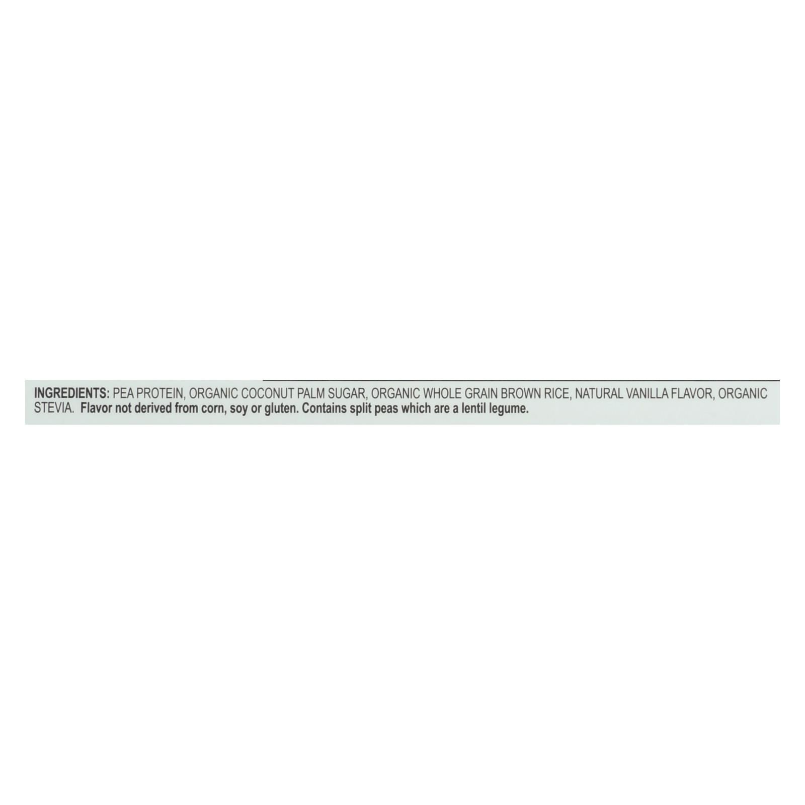 ingredients : pea protein;organic coconut palm sugar;organic whole grain brown rice;natural vanilla flavor;organic stevia
