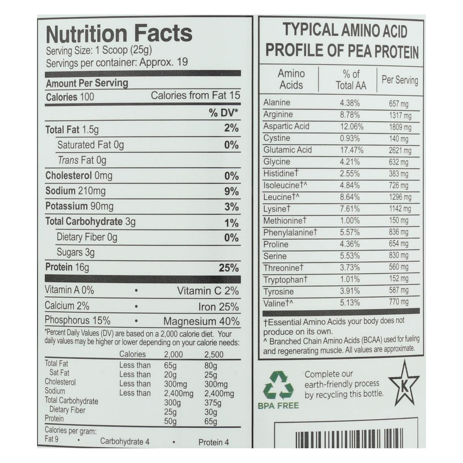 Growing naturals gold standard raw pea protein powder in vanilla blast provides a rich mix of vegetable-based protein, essential amino acids and vitamins to fuel your body anytime, anywhere. The powder in this 16.7 oz. Container delivers 16 g. Of protein per serving, so mix it with your favorite food or beverage to fuel your muscles. Made from raw north american peas, this vegan protein powder contains no artificial ingredients and is free of many major allergens for the peace of mind of those with dietary restrictions.