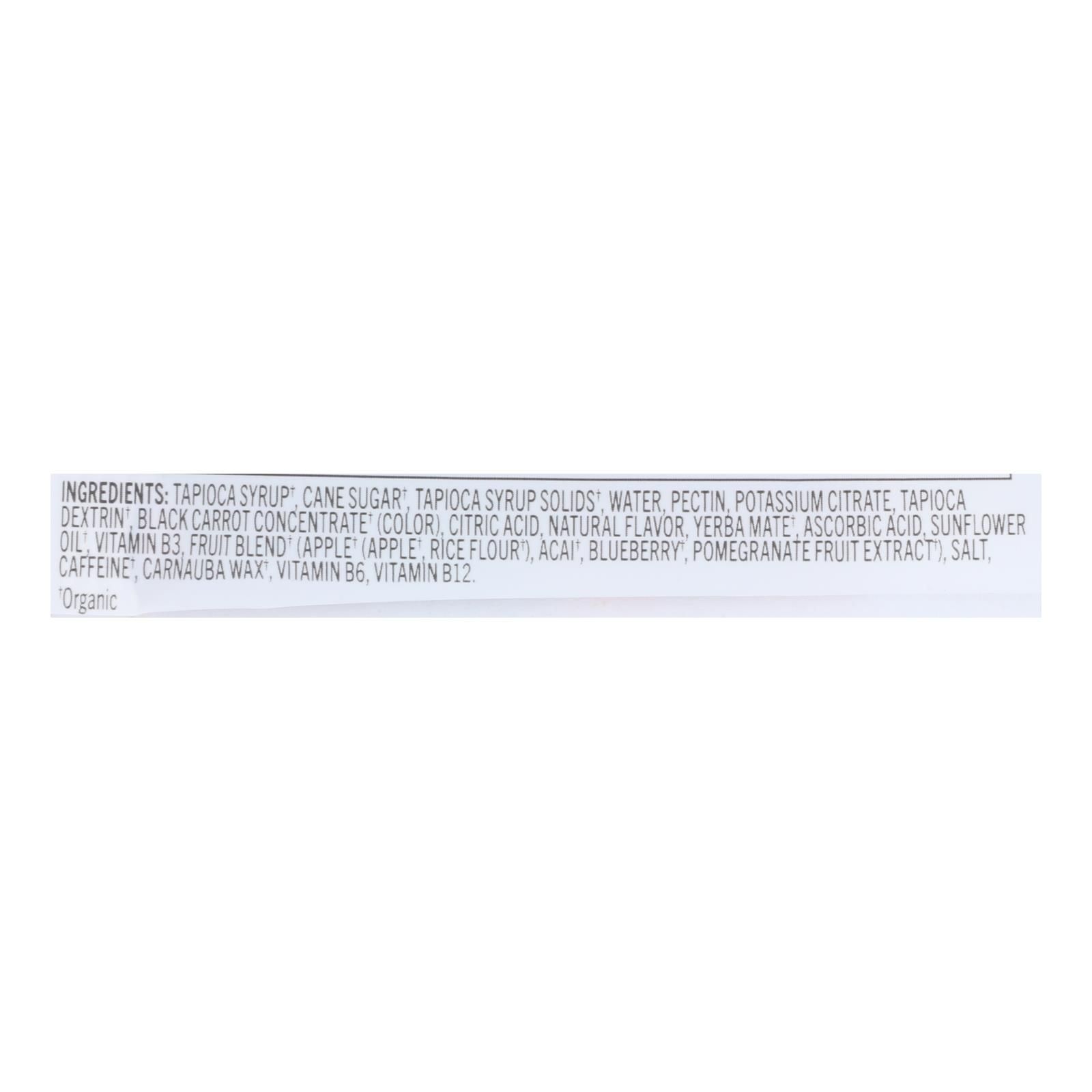 ingredients : organic tapioca syrup;organic sugar;organic tapioca syrup solids;pectin;citric acid;organic yerba mate extract;natural flavor;potassium citrate;color added;organic black carrot concentrate;ascorbic acid;organic fruit blend;organic apple powder;organic acai powder;organic blueberry powder;organic pomegranate powder;vitamin blend;vitamin b3;b6 and b12;sea salt;organic sunflower oil;carnauba wax