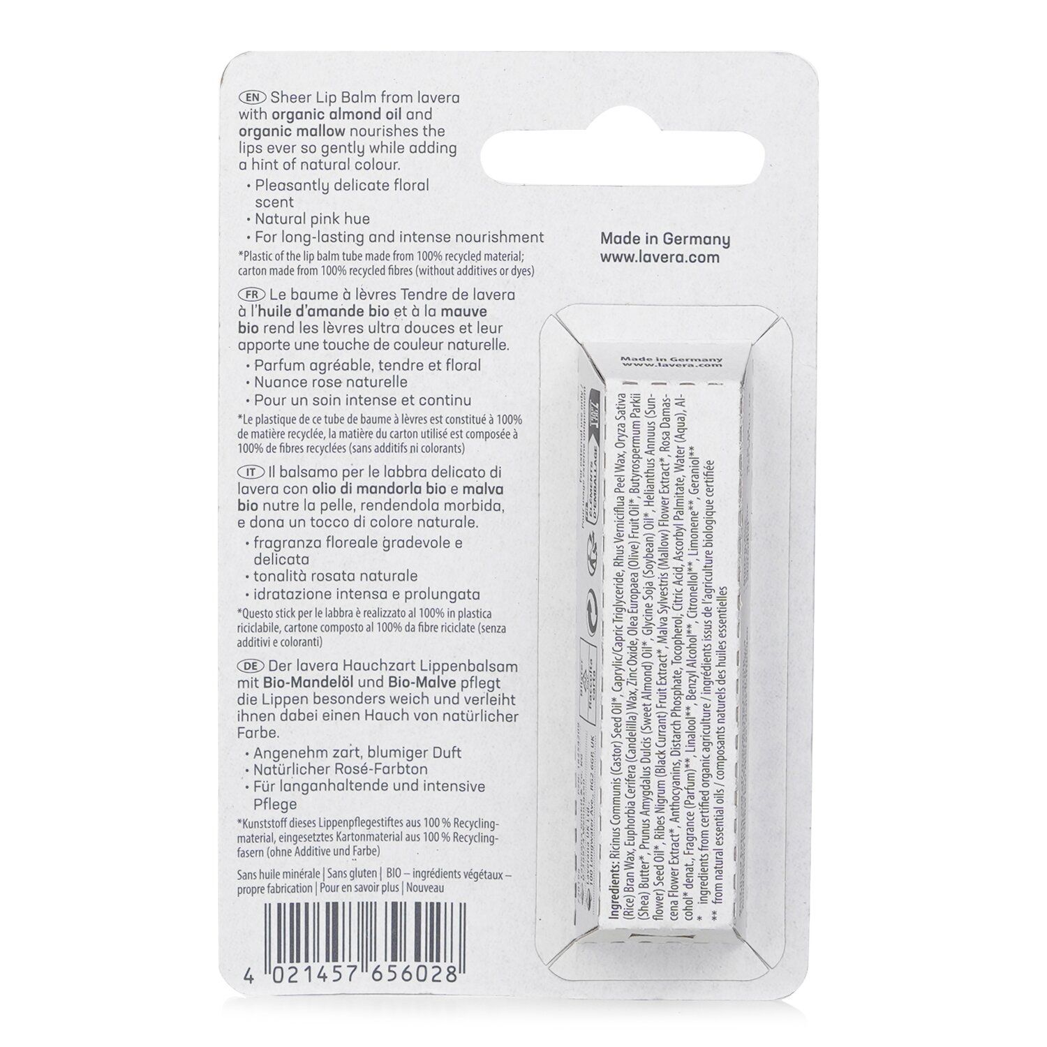 A lip balm that offers long-lasting & effective regenerating careInfused with organic almond oil & organic mallow, it gently nourishes the lipsAdds a hint of natural pink, beautifying your lipsCreates a long-lasting film on the lips, protecting them from drying outLeaves the lips soft & smooth, enhancing your oral hygieneDeveloped with climate-neutral green electricitySuitable for vegansMade in Germany