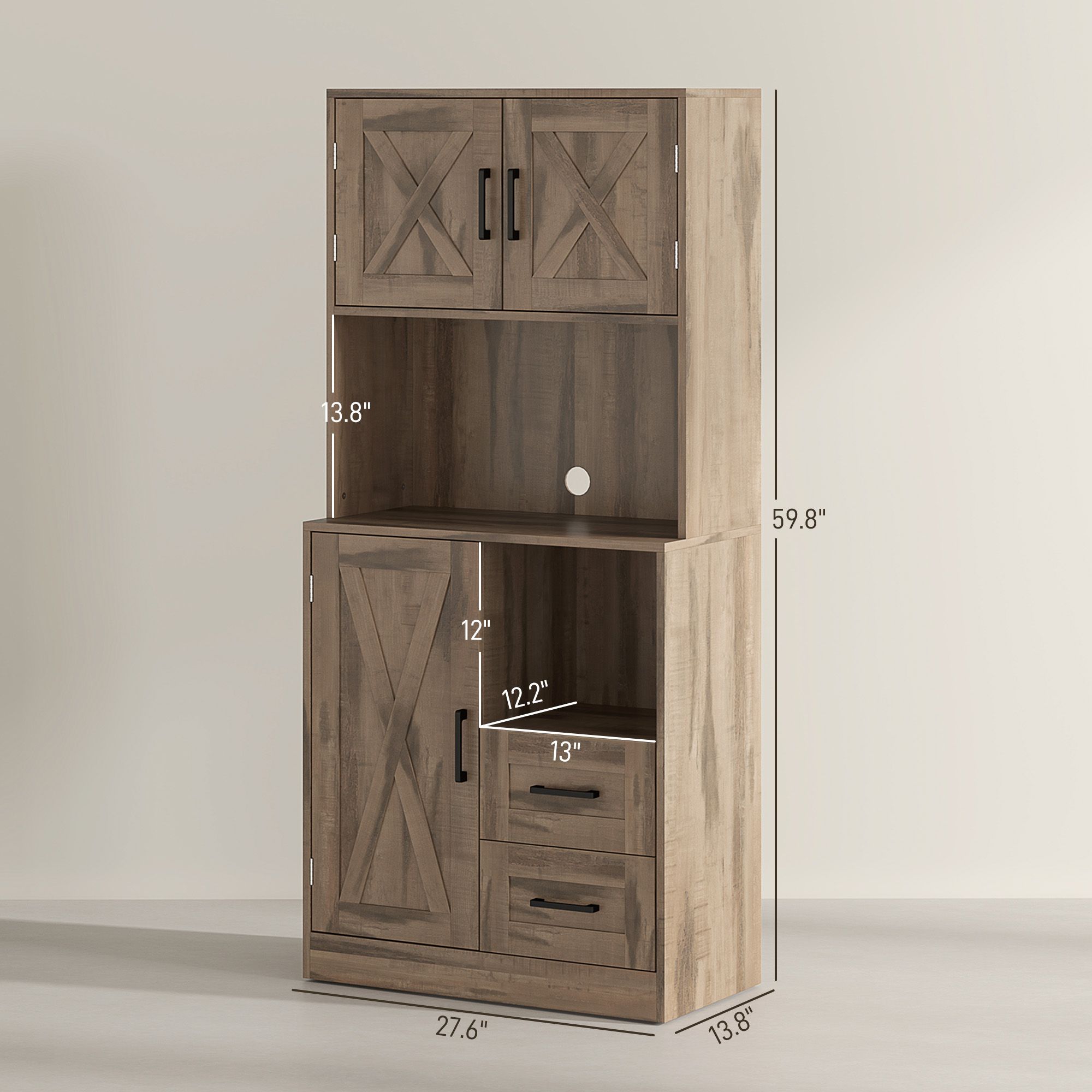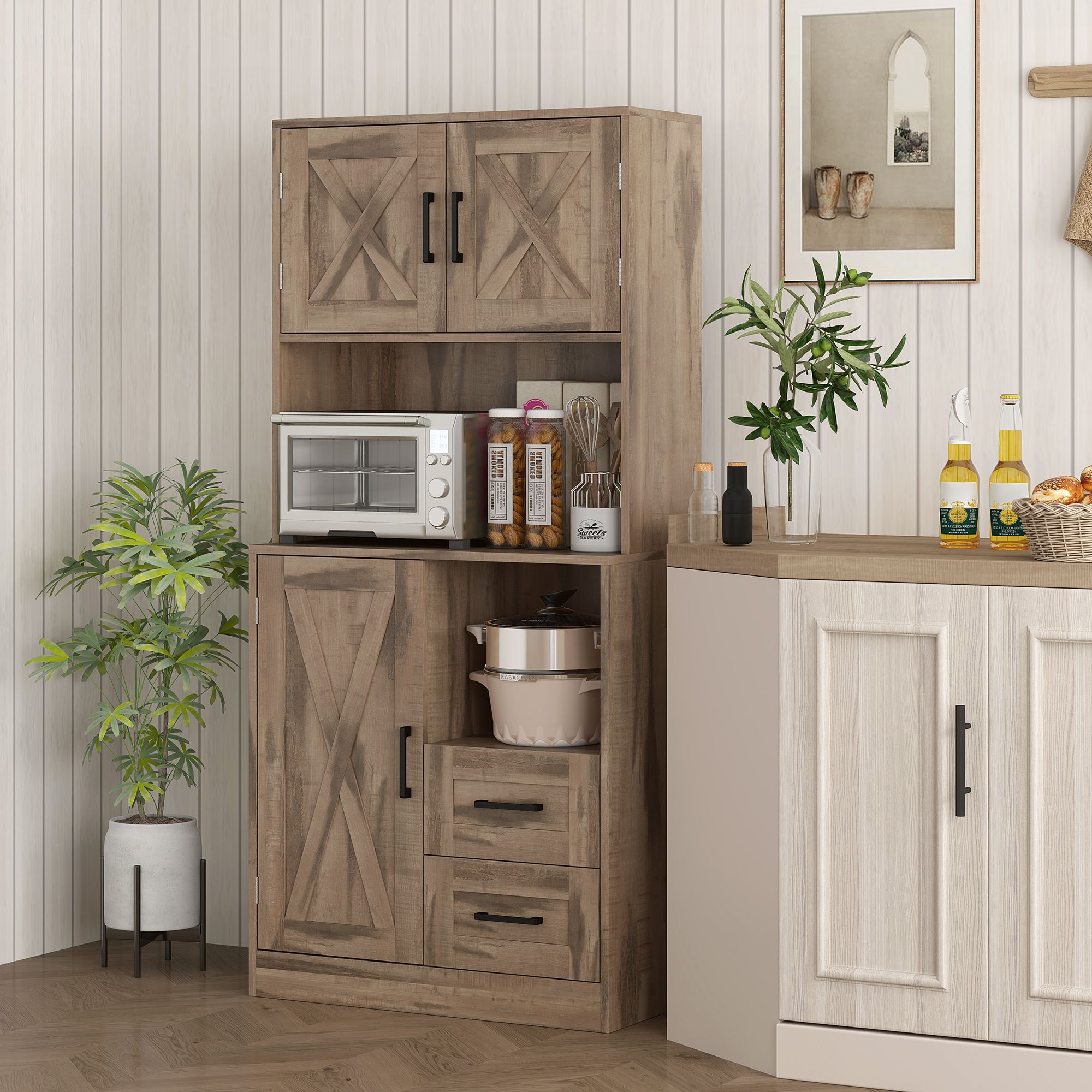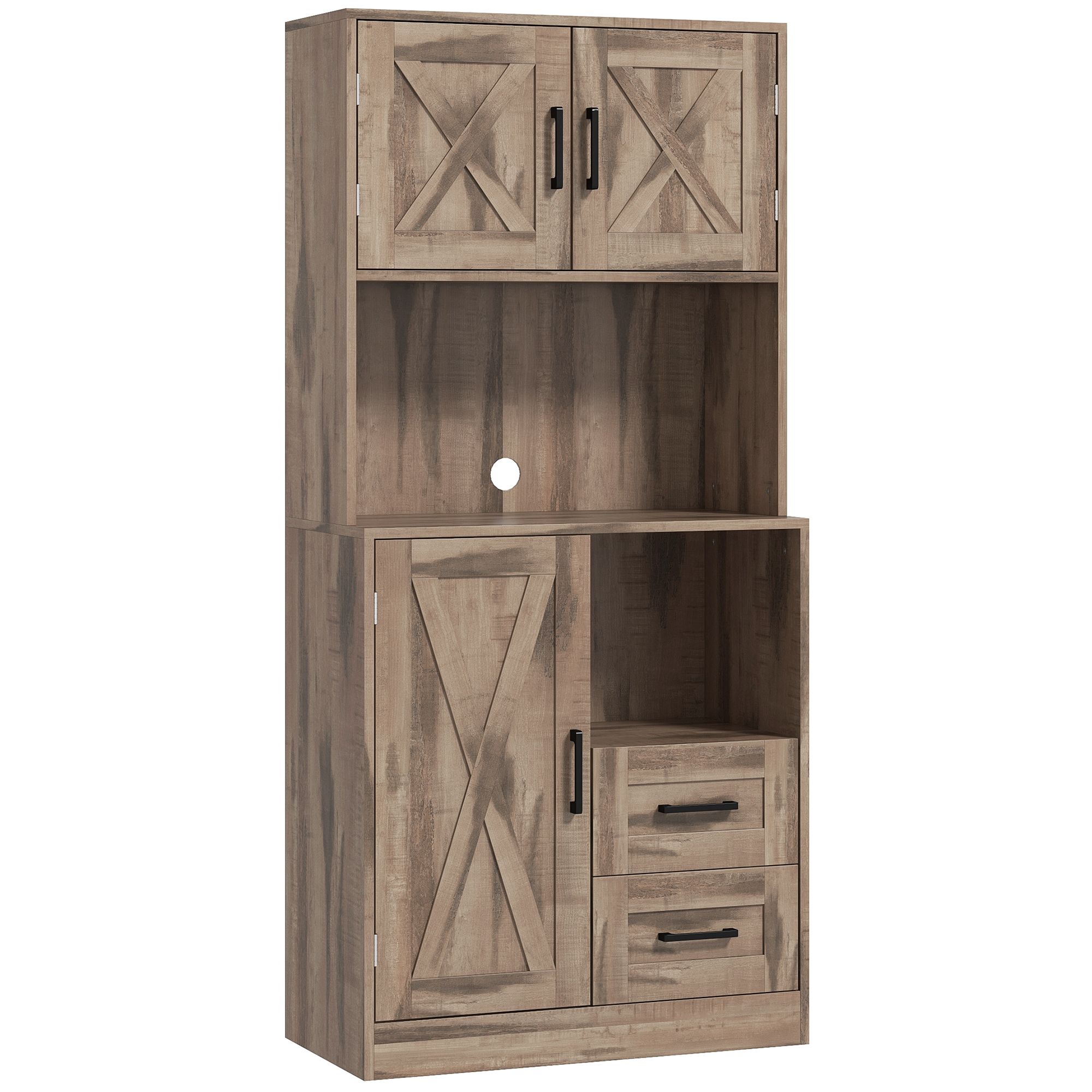 Unleash a touch of farmhouse charm in your kitchen with the HOMCOM pantry cabinet. This hutch cabinet with storage features a modern farmhouse design with retro wood panels and charming barn doors. Organize effortlessly with two spacious compartments, cupboards with adjustable shelves, and smooth-gliding drawers. Plus, keep your space neat with the handy cable management system! Great for any cozy kitchen nook.