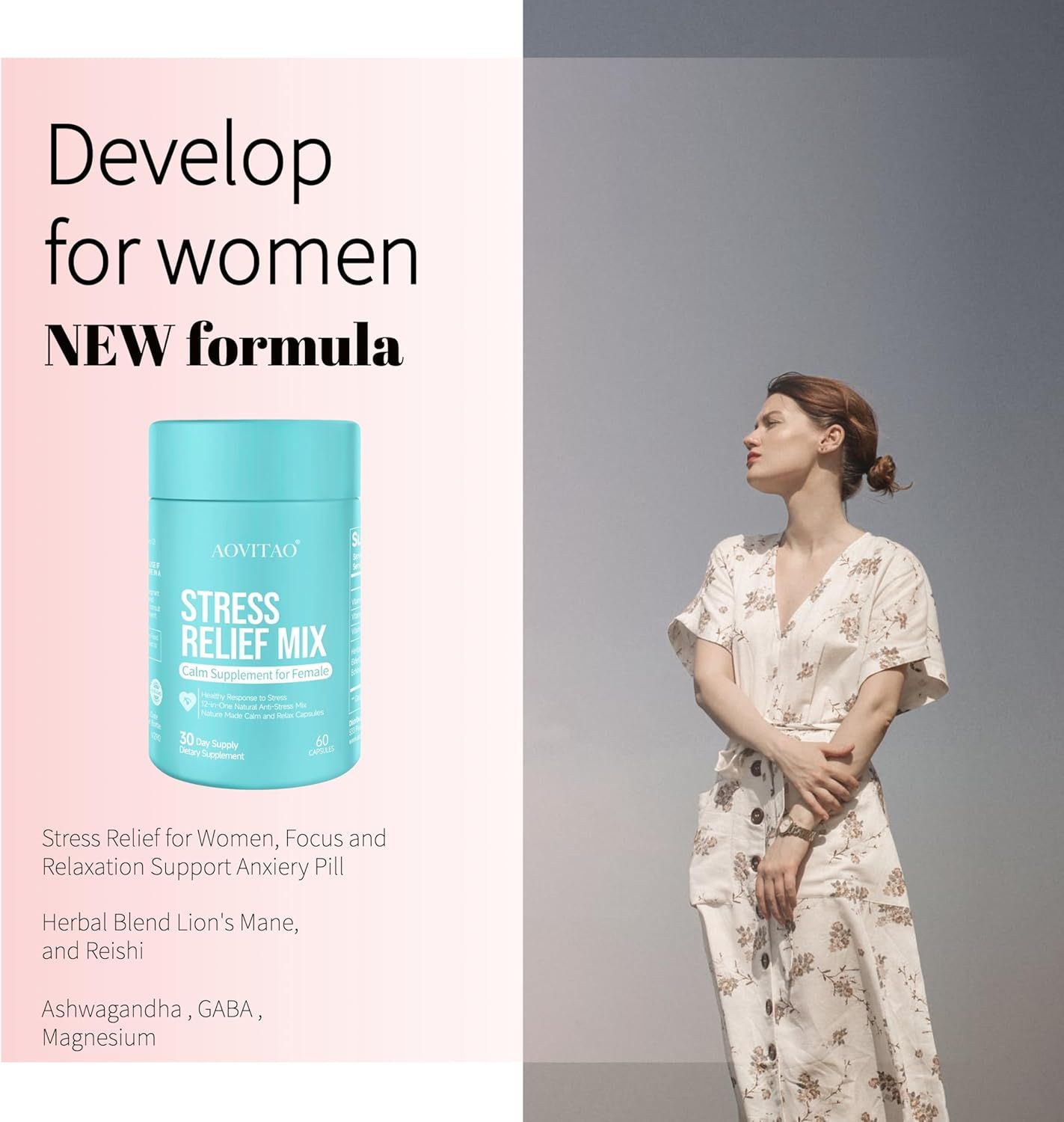 2.Brain Health Supplement – Contains Lion's Mane and Reishi mushrooms to enhance memory, focus, and mental clarity. This stress relief supplement also supports anxiety relief by promoting neural health and cognitive function.